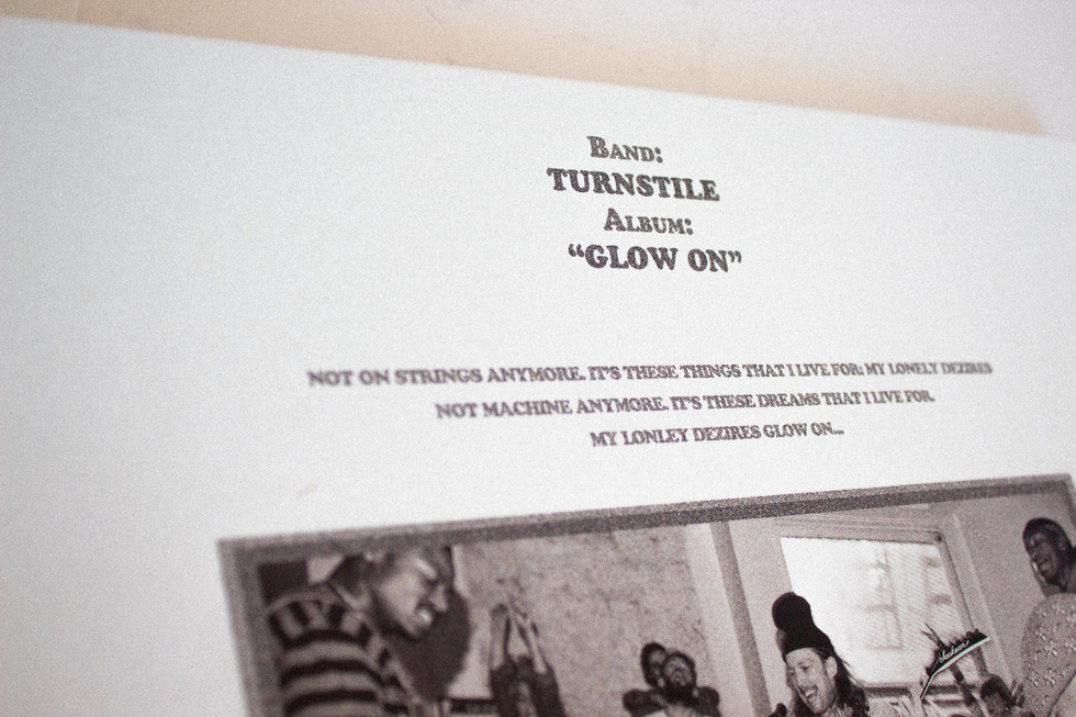 At just under 35 minutes "Glow On" is at the depth level of a novel, while it looks short on the surface, there are numerous layers to unpack, enjoy, and dissect that only gets better with each listen. That isn't to say that just because the album is short in run length means that the tracks are similar. While you'll find a lot of what makes Turnstile themselves, you also find a more experimental side of the band. "Glow On" is what you get when you take a hardcore punk band and let their outside musical preferences bleed into the tracks, its explorative but not in a way of being messy or chaotic. Turnstile's ability to flip the atmosphere and be as much of a shoegaze band as they are a hardcore band without losing sight of themselves is applaudable. When you spin "Glow On" you are giving your attention to Turnstile and allowing them to take you on a journey through their perspective.